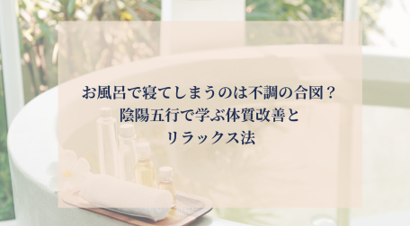 「気づいたらお風呂で寝てしまっていた…」 そんな経験はありませんか?温かいお湯に浸かってリラックスするのは心地よいですが、実はお風呂での寝落ちは思わぬ危険を伴うことも。 また、陰陽五行の観点から見ると、これは身体からの“ … 続きを読む お風呂で寝てしまうのは不調の合図?陰陽五行で学ぶ体質改善とリラックス法